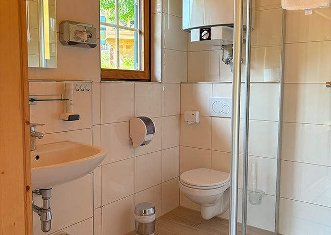 Bathroom with shower, toilet, hand wash basin and sufficient towels
